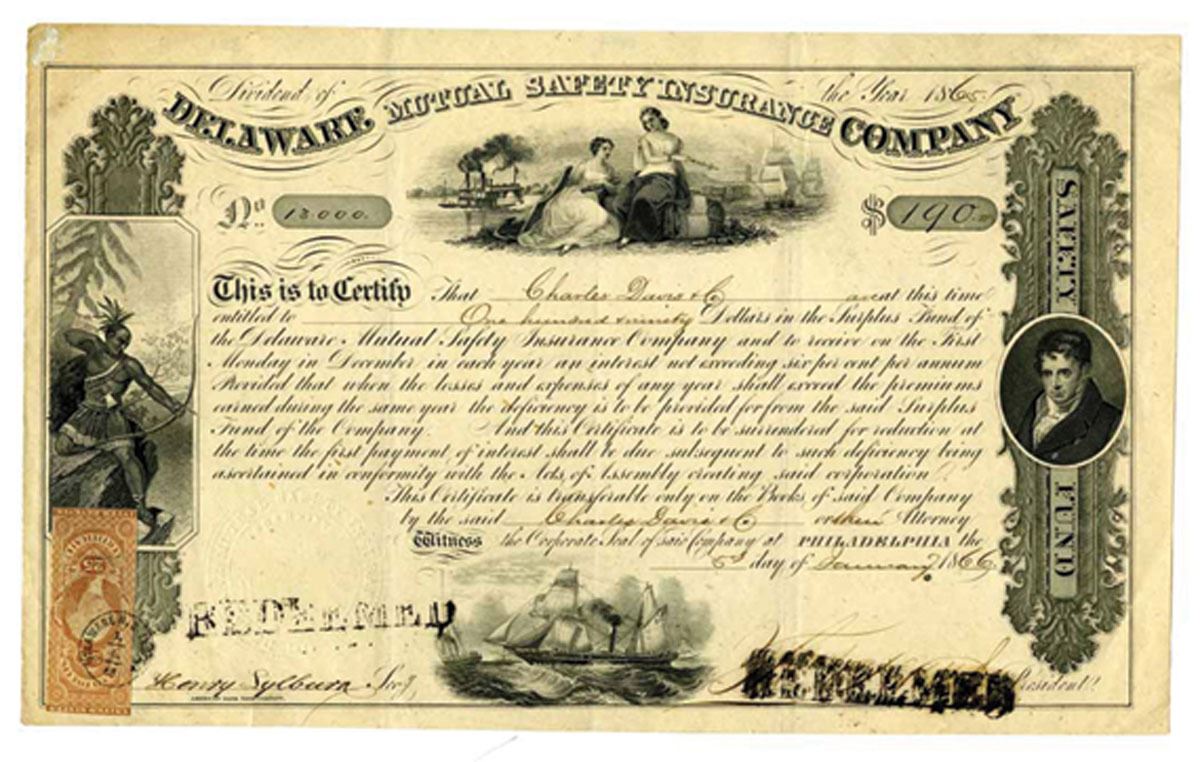 Delaware, 1866. $190.00 I/U 6% Bond, Black text with thin black border, Pair of allegorical women at top center, Native American man at left, and Portrait of a man at right. Brown internal revenue stamp at bottom left, Redeemed handstamps also at bottom. Fine condition, ABNC.