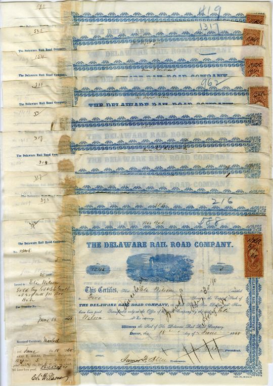 Delaware, 1867-68. Lot of 10, I/C Capital Stock Certificates Shares, Blue printing on blue border, Train rounding corner with workers at top, POCs and Ink Cancelled, Certificates are in VF to XF condition. (10). Sold "AS IS" no returns accepted. (ex. John E. Herzog Collection)