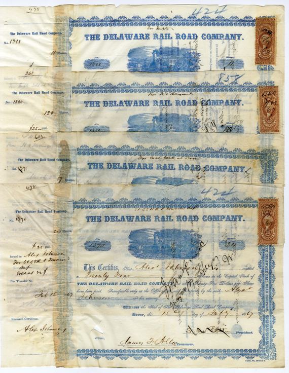 Delaware, 1867. Lot of 4 I/C Capital Stock Certificates for Varying Shares, Blue printing on blue border with train rounding corner with workers at top, All have revenue stamp at right side, POCs and Ink Cancelled, Certificates are in Fine-VF condition. (4). Sold "AS IS" no returns accepted. (ex. John E. Herzog Collection)