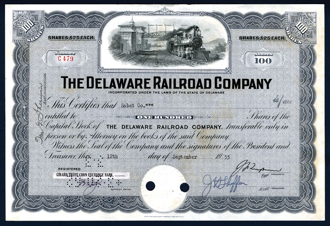 Delaware, 100 Shares, I/C, gray border and underprint, Locomotive under signal towers. ABNC.