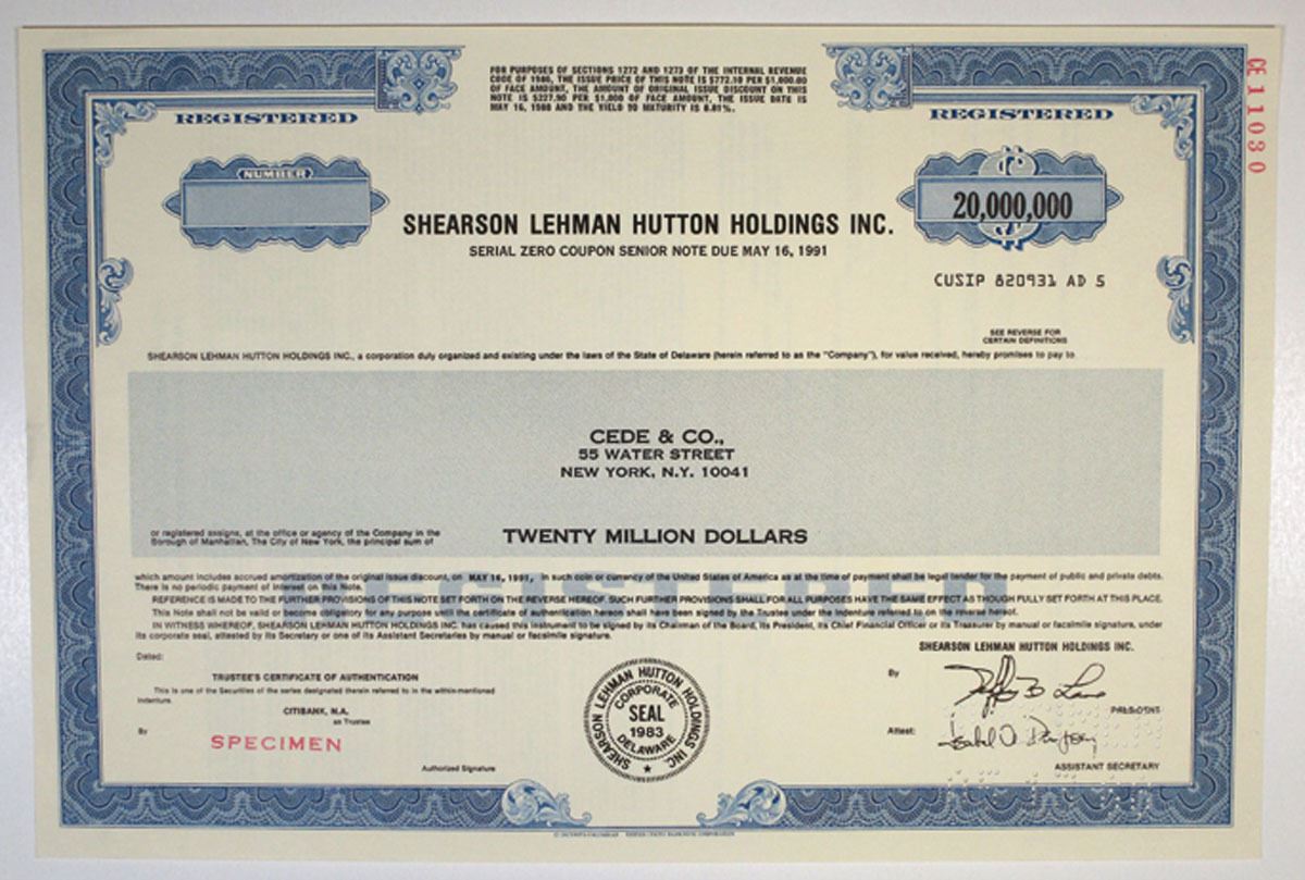 Delaware, 1988. $20 Million Registered Serial Zero Coupon Senior Note Specimen Bond, Black text with blue border and underprint. Red specimen overprint and specimen POCs. VF condition, S-C USBN.