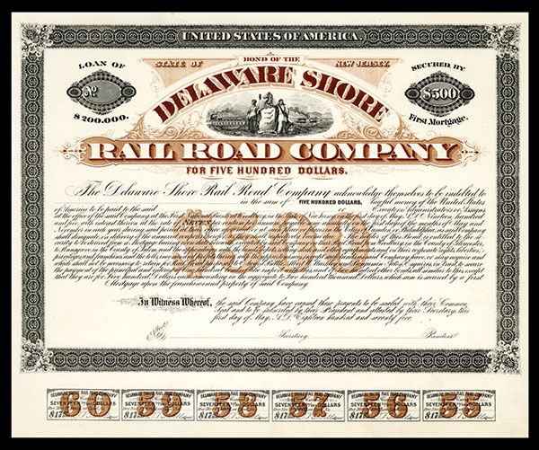 Camden, New Jersey, $500, Specimen or Proof bond, Black on light orange brown underprint, Arms of New Jersey in middle, 1st Mortgage, 7 % Mortgage bond, the road ran from Woodbury, County of Gloucester Pennsgrove in the County of Salem. Possibly unique and first time seen by cataloger, Cox lists a specimen for this railroad which is probably this example which was last offered in 1992. (ex-R.M.Smythe, Auction 110, November 23, 1992, Lot 5594).