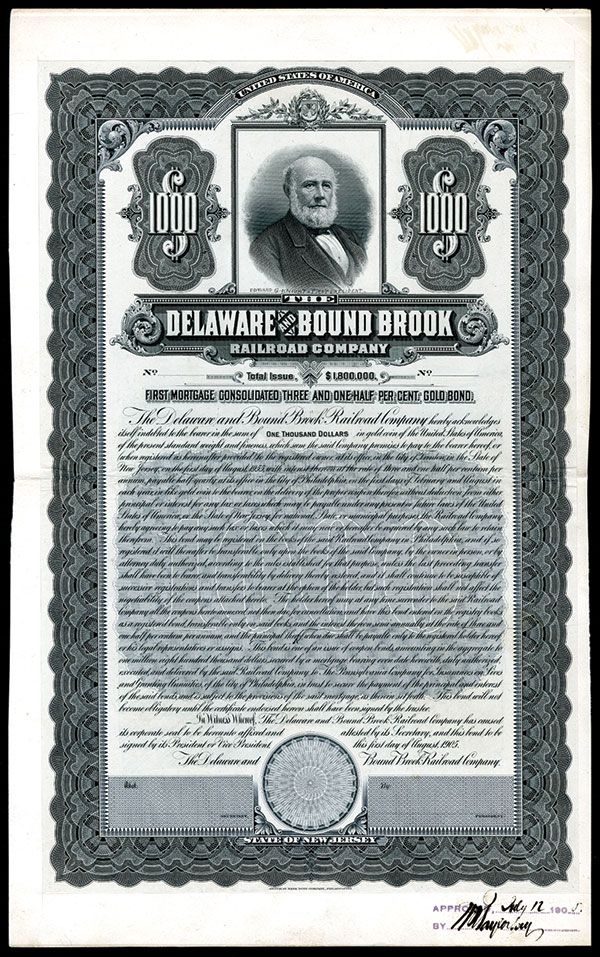 New Jersey. 1905. $1000 1st Mortgage 3 1/2% Gold Bond Proof. Black print with black ornate border and underprint. Vignette of railroad's first president, Edward G. Knight, top center. VF-XF condition. ABNC. Mounted on thick paper with archival approval stamp in bottom right corner. Listed railroad but unlisted bond proof in Cox.