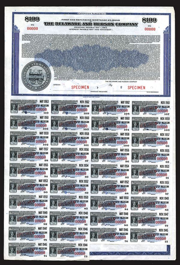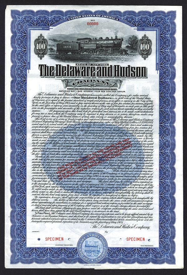 NY, Specimen $100 1st and Refunding Mortgage 4% Gold Coupon Bond, red overprint stating new terms in the supplement dated 1943, Black with green border and underprint, Locomotive #1054 L-R, Specimen overprints and POC's, VF condition with normal folds for storage, ABNC. Listed railroad in Cox, but unlisted denomination and color for reissued variety. Rare with only 3 found in archives of this variety.