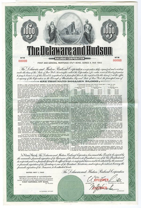 New York. $1000 Specimen 5 1/2% Series A 1st and General Mortgage Coupon Bond, Black print on green border and under tint, Allegorical figures flanking a barn at top, Specimen overprints and POC's, VF-XF condition, ABNC.