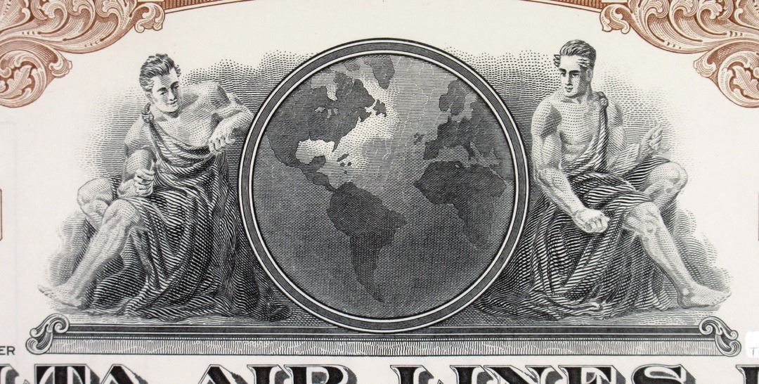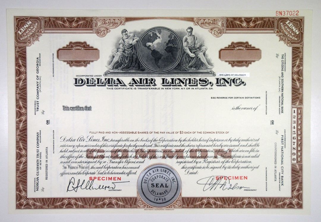 Atlanta, Georgia. 1940-50s, <100 Shares Specimen Stock Certificate, VF SBN Brown. Delta Air Lines, Inc., typically referred to as Delta, is one of the major airlines of the United States and a legacy carrier. It is headquartered in Atlanta, Georgia.