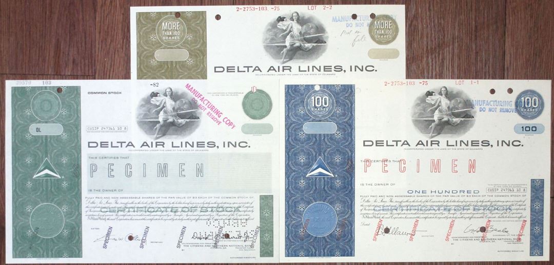 Delaware. Lot of 3 pieces: 1975 >100 Shares Specimen Stock Certificate in olive; 1975 100 Shares Specimen Stock Certificate in blue; 1982 Odd Shares Specimen Stock Certificate in green. All have 'Manufacturing Copy' stamps, Specimen overprints, and POCs. VF condition, ABNC. Delta Air Lines, Inc., typically referred to as Delta, is one of the major airlines of the United States and a legacy carrier. (3)