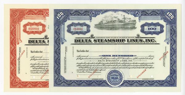 Louisiana. Pair of Specimen Stock Certificates, one for 100 Shares Capital Stock with a blue border, the other for odd Shares with a red border, Both certificates have a large steamship at top, Specimen overprints, and POC's, VF-XF condition, E.A. Wright BNC.