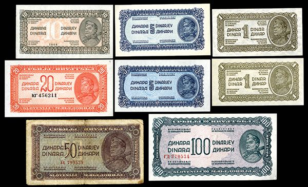 Democratic Federation of Yugoslavia, 1944, Group of 8 Issued Banknotes Yugoslavia, lot of 8, includes 1-, 5-, 10-, 20-, 50-, and 100 Dinara. P-48 to P-53. There are two varieties of each of the 1 Dinar and 5 Dinara. All AU-UNC except 50 Dinara, which is Fine.