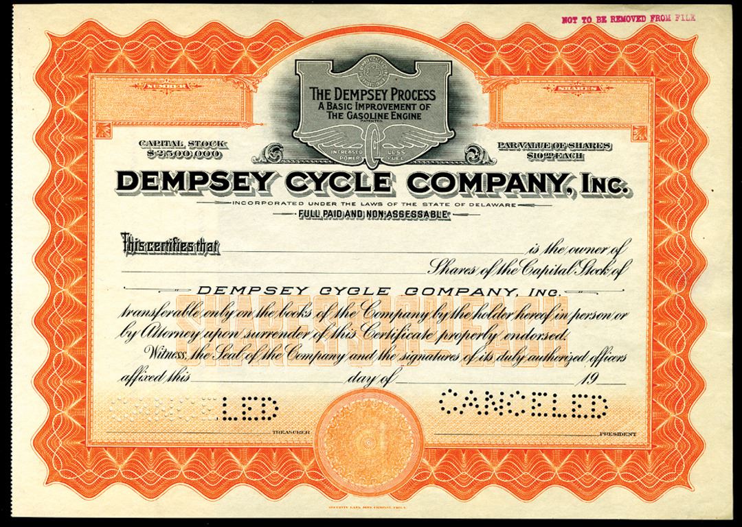 Odd Shares, Specimen stock certificate. Pin punch "Cancelled". Orange border. Logo states "The Dempsey Process - A Basic Improvement of the gasoline Engine - Increased Power - Less Fuel". VF. The company developed a process for improving automobile engines performance. SBNC.