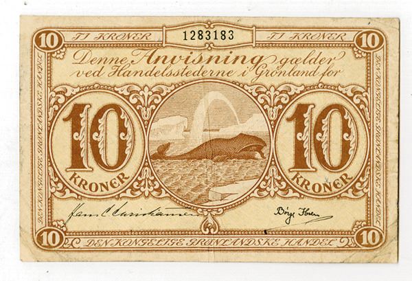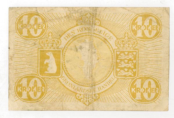Greenland, 10 Kroner, P-19b, Issued banknote, spouting whale middle, Brown on light yellow, S/N 1283183, VF condition, Attractive and popular note.