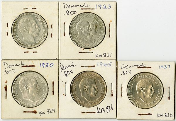 Denmark, Lot of 5 coins, Includes 2 Kroner, 1912, KM-811, XF; 2 Kroner, 1923, KM-821, AU-Unc; 2 Kroner, 1930, KM-829, Unc; 2 Kroner, 1937, KM-830, Choice Unc; and 2 Kroner, 1945, KM-836, Choice Unc. (5)