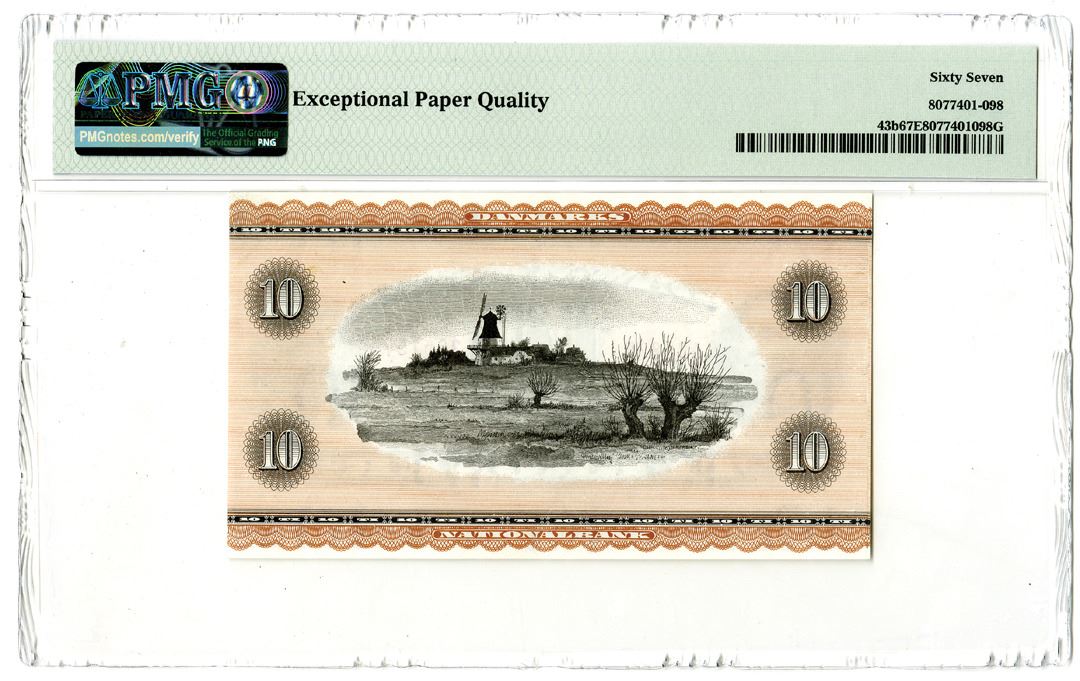 Denmark. 1951. 10 Kroner, P-43b, Issued banknote, Gray on brown underprint, S/N A3687B 3251578 - Prefix A3, PMG graded Superb Gem Uncirculated 67 EPQ. This is the only graded example to be offered of this type in the PMG census. Only circulated examples have been offered previously at auction. This is the only Superb Uncirculated note to be offered at auction.