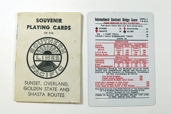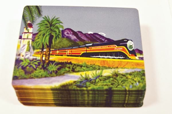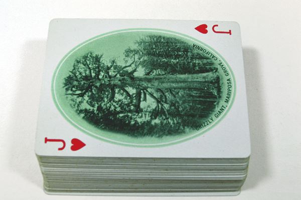 Steam train in Royal Gorge. Cards have different view on each. Includes one Joker card. Gilt edges, very nice. Maroon case and slipcover, signs of good honest wear. Published by the Interstate Co.