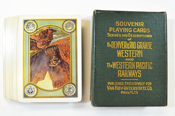 CO. Denver & Rio Grande Western Railroad. Playing Card features a steam locomotive thru Royal Gorge. Different duo-tone views on each card. No joker. In green slipcase and cover.
