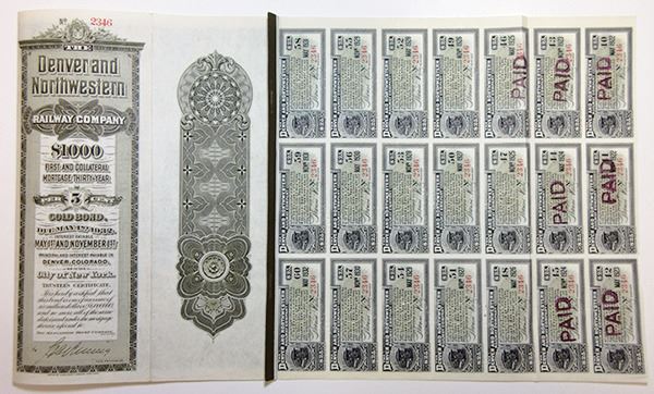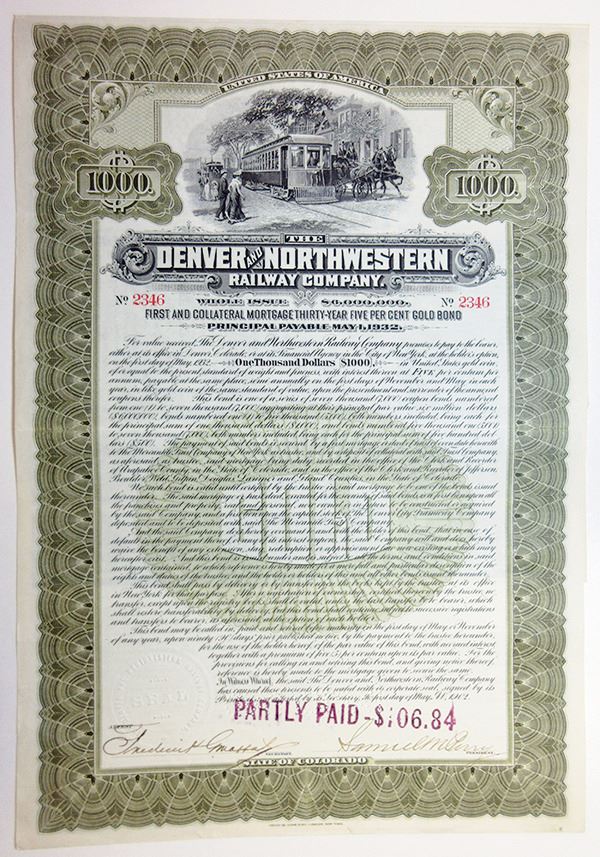 Colorado, 1902, $1000, 5% 1st and Collateral Mortgage Gold Coupon Bond, I/C Bond,, Black on olive border and underprint, Electric trolley moving down city road top center with horse and buggy on right, VF condition, ABNC. Also included is an unissued Denver and Middle Park Railroad Co., ca.1870-90, Stock Certificate, Unc.
