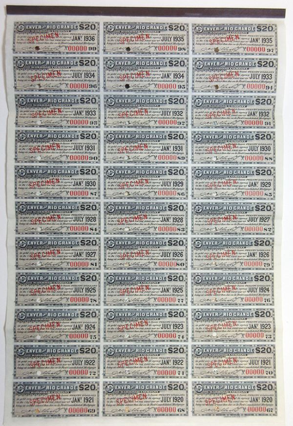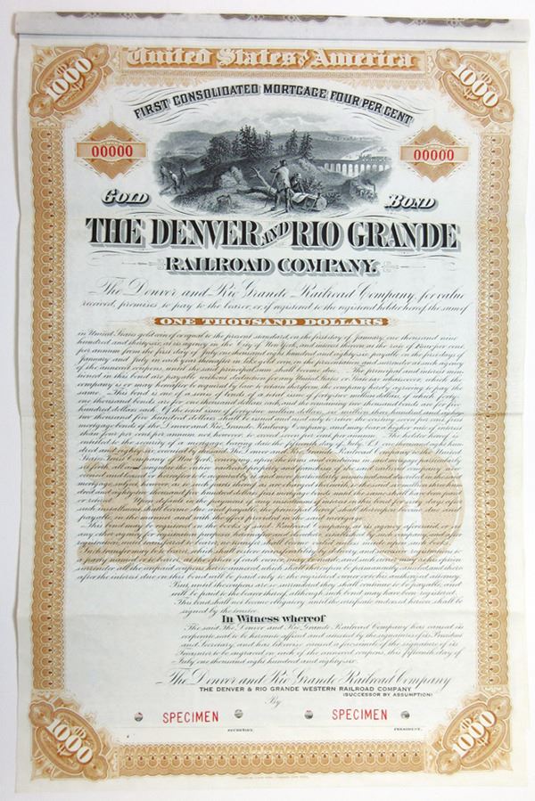 Colorado & Utah. $1,000 Specimen 4% First Consolidated Mortgage Coupon Bond, Black print on sand brown border and under tint, Surveyors and track layers on hilltop looking out at locomotive crossing bridge in distance, Specimen overprints and POC's, VF-XF condition, ABNC.