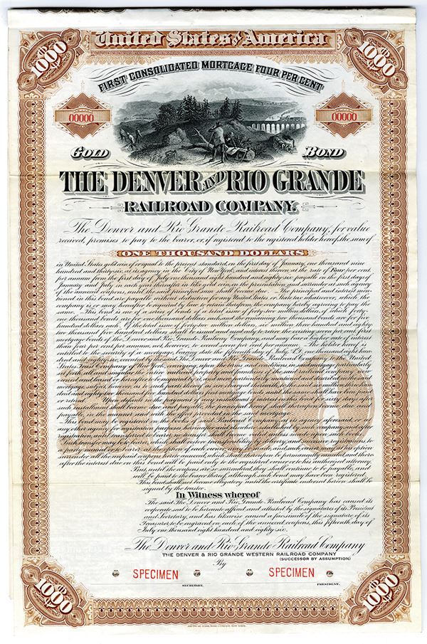 Colorado, 1886. $1000 Specimen 4% First Consolidated Mortgage Bond, Black text with brown border and underprint, Men at work in wilderness with train passing by in distance at top center. Red specimen overprints, 00000 serial numbers, POCs. VF condition, ABNC. Rare as a specimen.