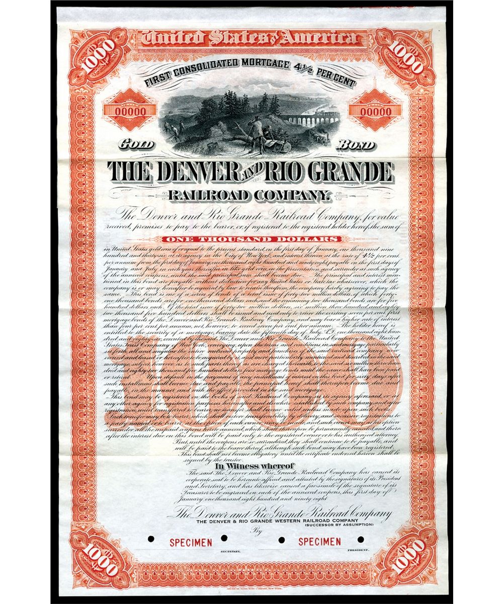 Colorado, $1000 1st Consolidated Mortgage 4 1/2% Gold Coupon Bond. Orange border, Surveyor with hills and small train in background, ABNC. XF. Unlisted bond design, type and date in Cox.
