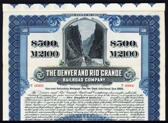 Colorado.1908, $500 - M2100. 5% 1st and Refunding Mortgage Gold Bond. Blue border an underprint with ÒRoyal GorgeÓ vignette. U.S. and German denominations. ABNC. Specimen w/coupons, XF. Unlisted bond design, type and date. Rare and very attractive blue color.