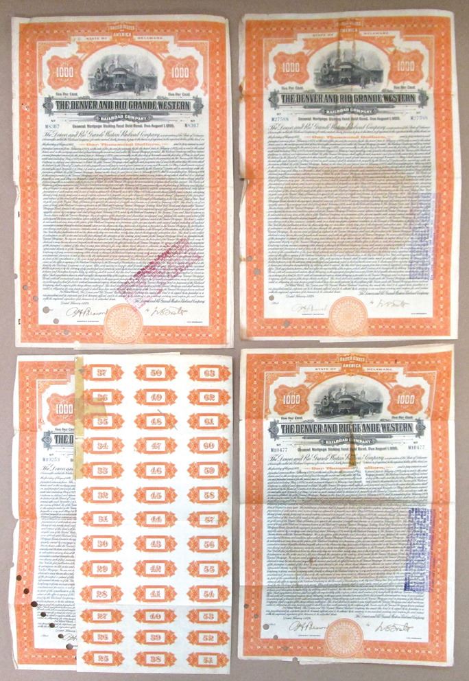 Colorado, (Inc. in Delaware), 1924. Lot of 4, $1000 I/C 5% General Mortgage Sinking Fund Gold Coupon Bond, Black text with orange border and undertint, Pair of trains at busy station at top center. POCs, Fine condition with damage to margins, staining, and staple holes. ABNC. (4). Sold "AS IS" no returns accepted.
