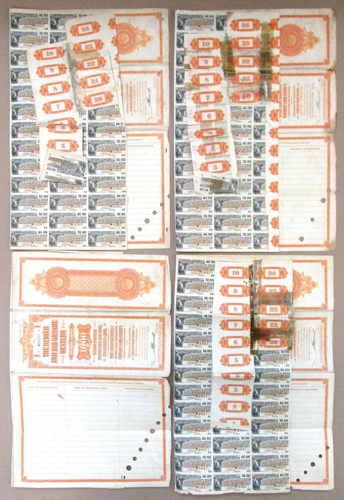 Colorado, (Inc. in Delaware), 1924. Lot of 4, $1000 I/C 5% General Mortgage Sinking Fund Gold Coupon Bond, Black text with orange border and undertint, Pair of trains at busy station at top center. POCs, Fine condition with damage to margins, staining, and staple holes. ABNC. (4). Sold "AS IS" no returns accepted.