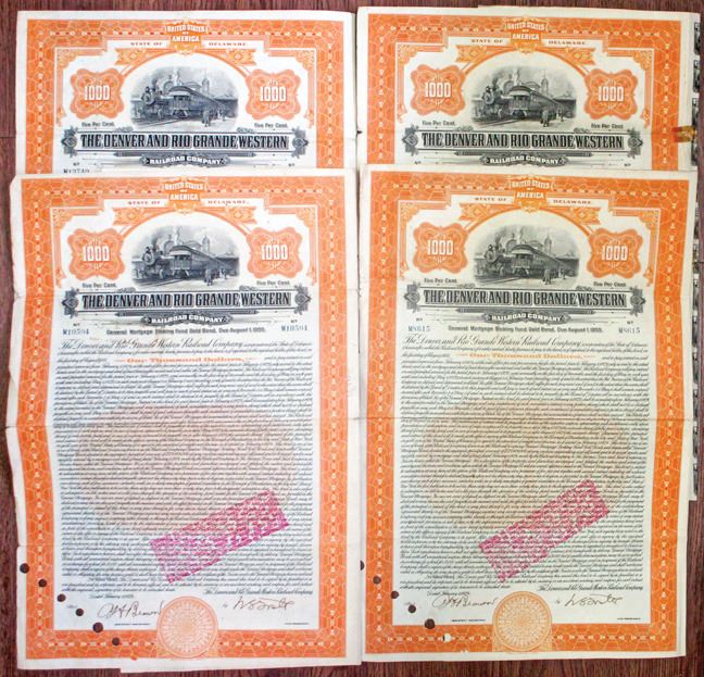 Colorado, (Inc. in Delaware), 1924. 4 pieces, all the same: $1000 I/C 5% General Mortgage Sinking Fund Gold Coupon Bond, Black text with orange border and undertint, Pair of trains at busy station at top center. POCs, Fine condition with damage to margins and some staining and staple holes. ABNC. (4)