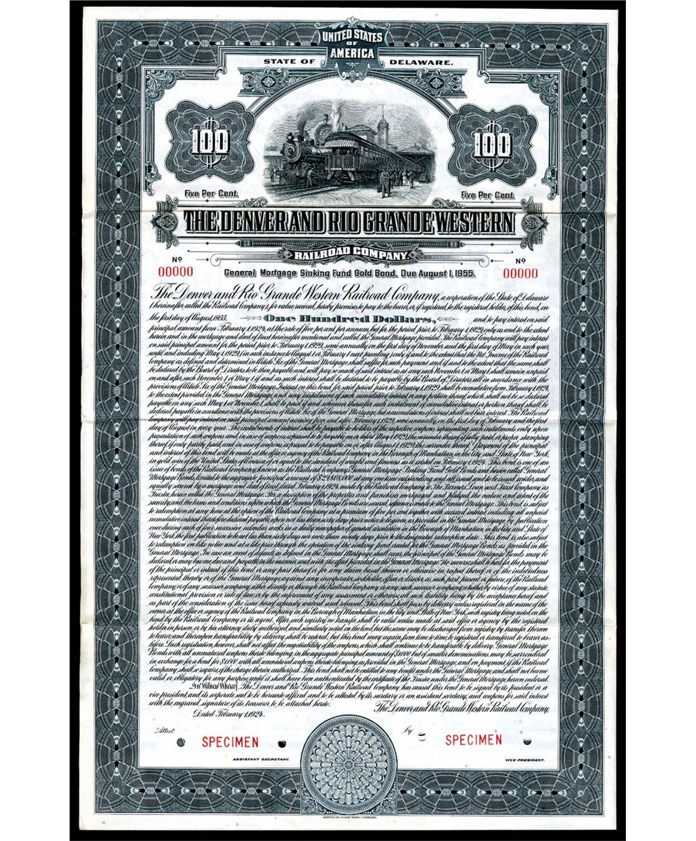 Colorado. $100 General Mortgage Sinking Fund Gold Coupon Bond Specimen. Trains at station. POC's. Coupons attached. VF condition. ABNC.
