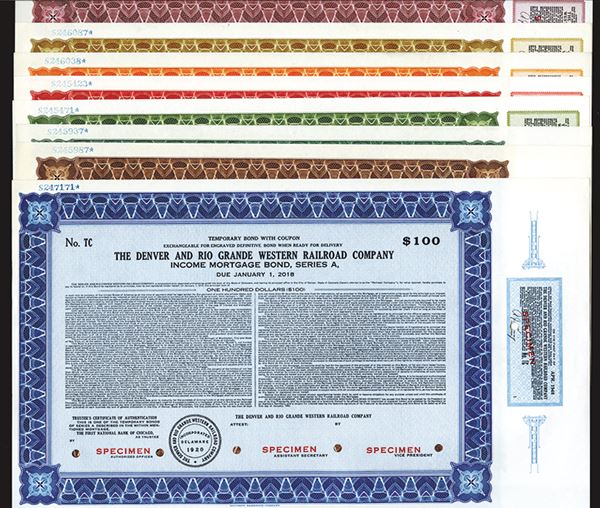 Colorado. Lot of 10 bonds, 3 different bond issues of $100; $500 and $1000 each and a Scrip Certificate, Includes 1943, 1st Mortgage Bond Series A Due 1993, 3% Fixed Interest; 1947, Denver and Salt Lake Income Mortgage Bond, 3% Fixed Interest and 1% Contingent Interest; and 1943 Income Mortgage Bond, series A, 4 1/2%, All in various colors, VF-XF, SBNC. All are rare and all are unlisted in Cox as Temporary bonds.