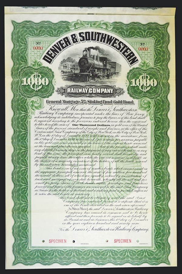 Colorado (inc. in NJ). Specimen 1889. $1000 General Mortgage 5% Sinking Fund Gold Coupon Bond. Green border and undertint. Locomotive #15 with man standing beside it. XF condition. Red specimen overprint and POC's. ABNC. Unlisted as a bond in Cox and this is the only one found in the archives and possibly unique.
