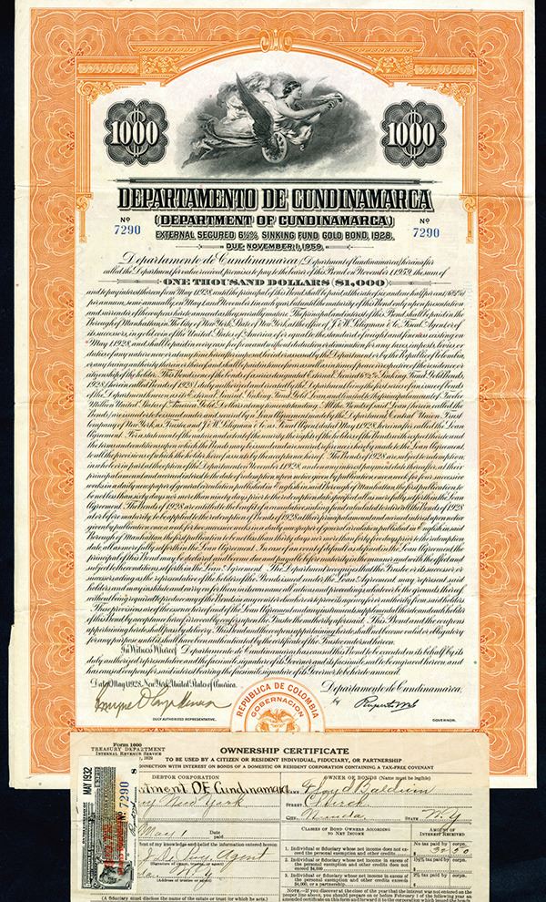 Colombia. $1000 Issued and uncancelled, 6 1/2% External Secured Sinking Fund Gold Coupon Bond. Black printing with orange border and underprint. Allegorical woman with winged wheel top center. VF condition with all coupons attached. ABNC. Ownership certificate with attached coupon included with bond. Certificates were issued for corporations containing a tax free covenant. Rare I/U and possibly speculative.