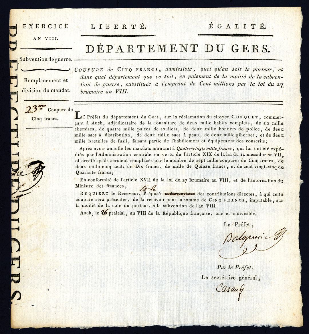France, 8.5 x 9.25 inches, 1 page, "Subvention de Guerre - Replacement et division du Mandat - 23 mo., Coupre de Cinq Francs", (War Subsidy - Replacement and Division of Mandate), VF to XF condition. Rare early French fiscal document.