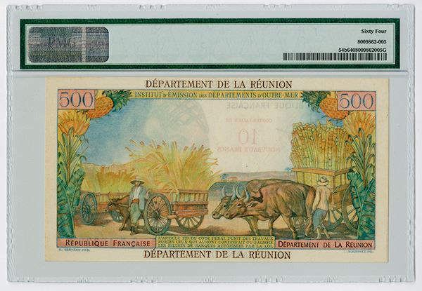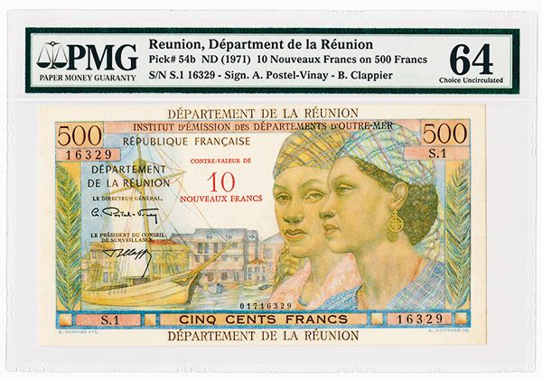 ReunionÆ’ 10 Nouveaux Francs on 500 Francs, P-54b, Signature A, 2 women at right, sailboat at left, S/N S.1 16329, PMG graded Choice Uncirculated 64.