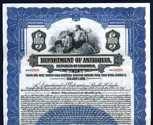 Colombia, $1000, Series B 7% 20 Year External Secured Sinking Fund Gold Specimen Bond, Black on blue border and underprint, Reclined allegorical woman top center holding oceanliner and globe, POC's and red SPECIMEN overprints, VF condition, ABNC.