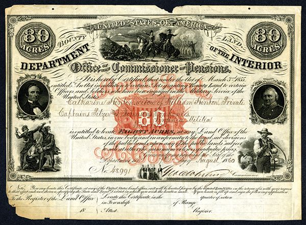 Department of the Interior, War of 1812 80 Acres Bounty Land Grant. U.S., August 1860, 80 Acres Land Grant Certificate, Act of March 3rd, 1855 entitled "An Act in addition to certain Acts granting Bounty Land to Certain Officers and Soldiers who have been engaged in Military Service of the United States". Issued and Uncancelled, Jefferson Davis Portrait on left as Secretary of War, General Winfield Scott on right with Soldiers on horseback with men behind them and destruction in front of them, Allegorical male reaper on lower right and Indian trying to kill woman and child being rescued by outdoorsman, red underprint of Cannon, drums, patriotic shield, flags and "80 Acres" in middle. Cert.#48991. Issued to Catherine Hinton, widow of William Hinton, Private, Captains Pitzer and Johnson's Companies, Virginia Militia, War of 1812. Toning on left margin, a small piece missing from the lower left corner far from design and a small piece out of the top middle excess margin not touching design. Attractive and rare War of 1812 Bounty Certificate. RWHE.