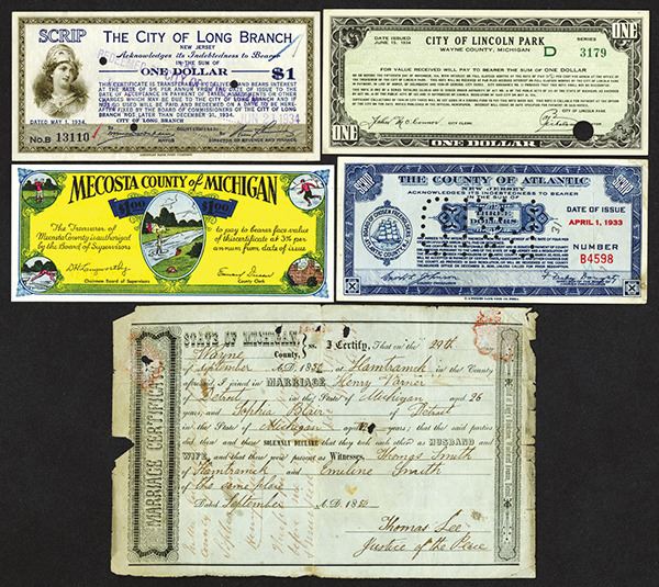 U.S. Mostly Issued and cancelled. VF or better. Includes a 1850 Hamtramck, MI. Marriage certificate. 14 pieces.