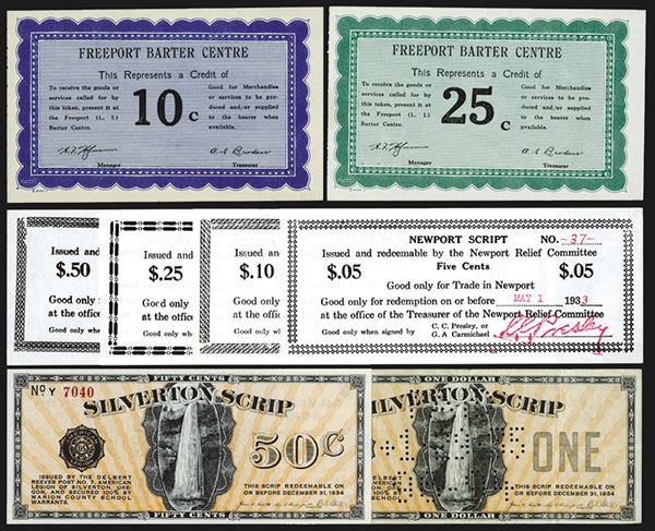 Depression script. Freeport (NY) Barter Centre 10c, 25c, uniface; Newport 5c, 10c, 25c, 50c, uniface; Silverton (OR) 50c, $1. The latter with a perforated PAID cancel. First seven are Extremely Fine or better, the last is Fine-Very Fine. 8 pieces