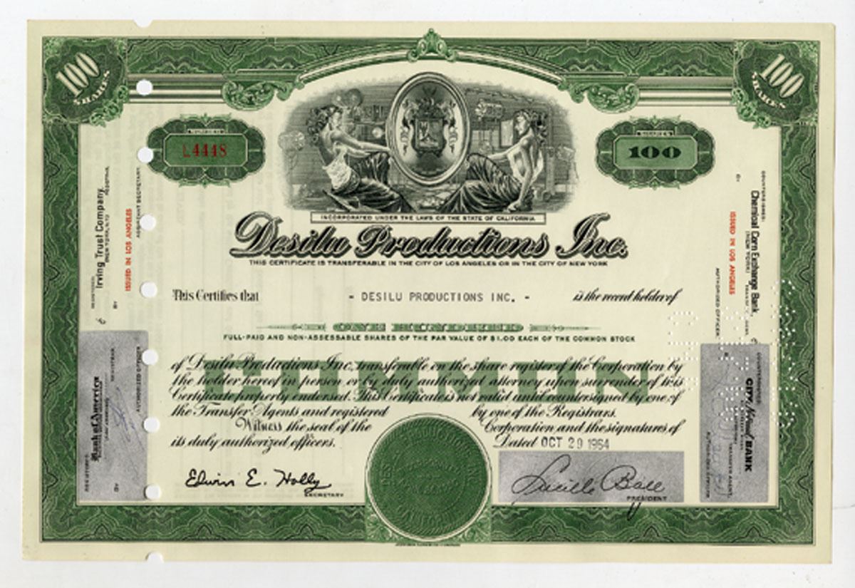 California, 1964. 100 Shares Common Stock I/C Certificate, Black on green border and underprint, Pair of Allegorical women at top with camera equipment, Facsimile signature of Desi Arnaz under silver bar at bottom that was covered and signed by Lucille Ball over silver bar. (You can see the bottom of his "Z" hanging over the green border). Certificate is in Uncirculated condition, ABNC. Desilu Productions, Inc. was an American television production company founded and co-owned by husband and wife Desi Arnaz and Lucille Ball. The company is best known for shows such as I Love Lucy, The Lucy Show, Mannix, The Untouchables, Mission: Impossible and Star Trek. Until 1962, Desilu was the second-largest independent television production company in the United States, behind MCA's Revue Studios, until MCA bought Universal Pictures and Desilu became and remained the number-one independent production company, until Ball sold it to Gulf and Western Industries (then the parent company of Paramount Pictures) in 1968.