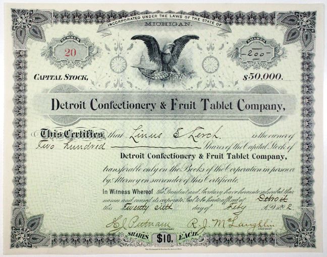 Detroit, Michigan, 1892. 200 Shares I/U Capital Stock Certificate, S/N 20, Black text with gray border and light green background, Eagle with flag at top center. VF condition.