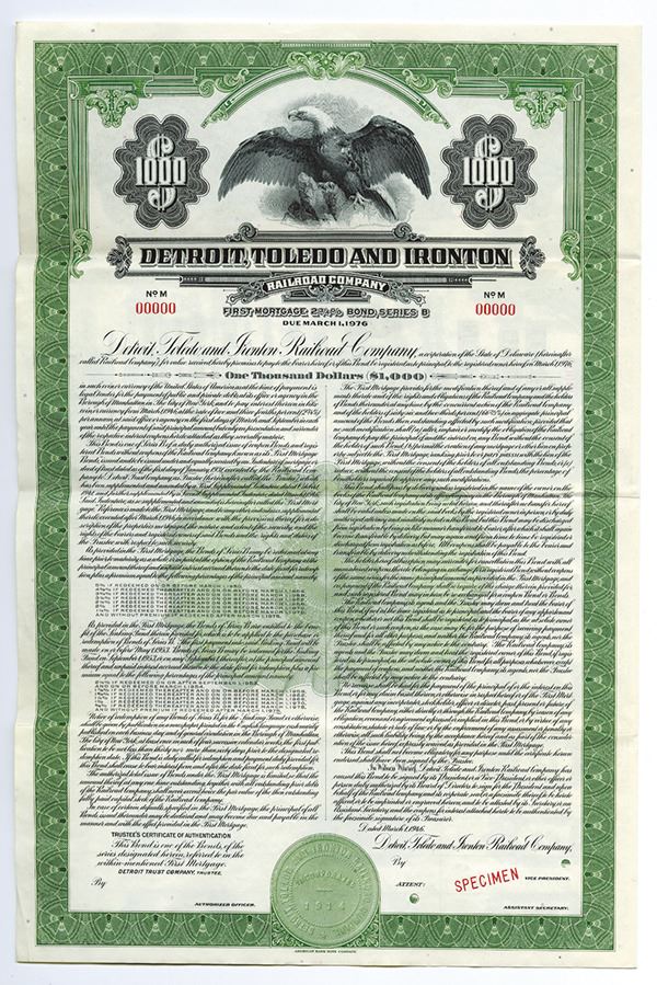 Delaware. $1000 Specimen 2 3/4% Series B 1st Mortgage Coupon Bond, Black print on green border and under tint, Bald Eagle at top, Specimen overprints and POC's, VF-XF condition, FL-ABNC.