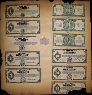 1933-34. Banknotes. City of Detroit and City of Hamtramck depression scrip proof fronts and backs mounted on 15.5 by 16 inch light brown paper. Denominations of Detroit notes include $1 (3); $2; $5 (3); $10 (2); $20 (2); $1000. Some have signature blocks cut out. Also includes one set of backs for the Detroit issue and 1/2 of a $1000 front in bad shape. Denominations of Hamtramck notes are $1; $5 and $10. Condition is mixed. Unique proof sample page in archive. Please inspect. Columbian BNC.