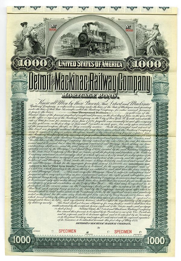 Michigan. $1000 Specimen 4% Mortgage Coupon Bond, Black print on ornate blue border and under tint, Gentleman standing beside locomotive at top, Specimen overprints and POC's, Fine-VF condition, ABNC. Unlisted as a coupon bond in Cox, only as a registered bond.