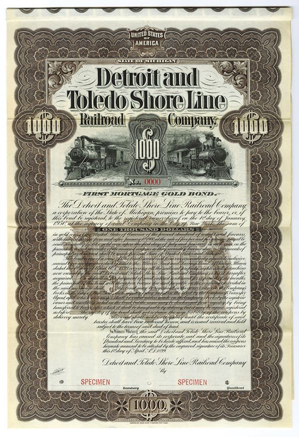 Michigan. $1000 Specimen 5% 1st Mortgage Gold Coupon Bond, Black print on brown border and under tint, Locomotives at top coming out from behind company title, Specimen overprints and POC's, VF-XF condition, ABNC. Listed railroad on Cox, unlisted bond design, variety and earliest date listed.