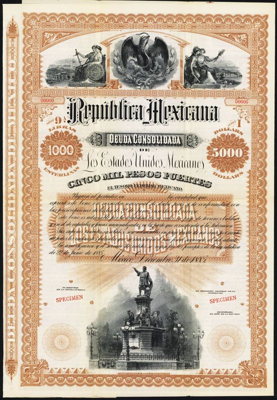 Mexico, 1885, $5000, Series 9 Specimen Bond, Black on light brown border and underprint, Arms of Mexico flanked by allegorical women on left and right and large monument on bottom, coupons attached, VF-XF condition, ABNC, rare and attractive.