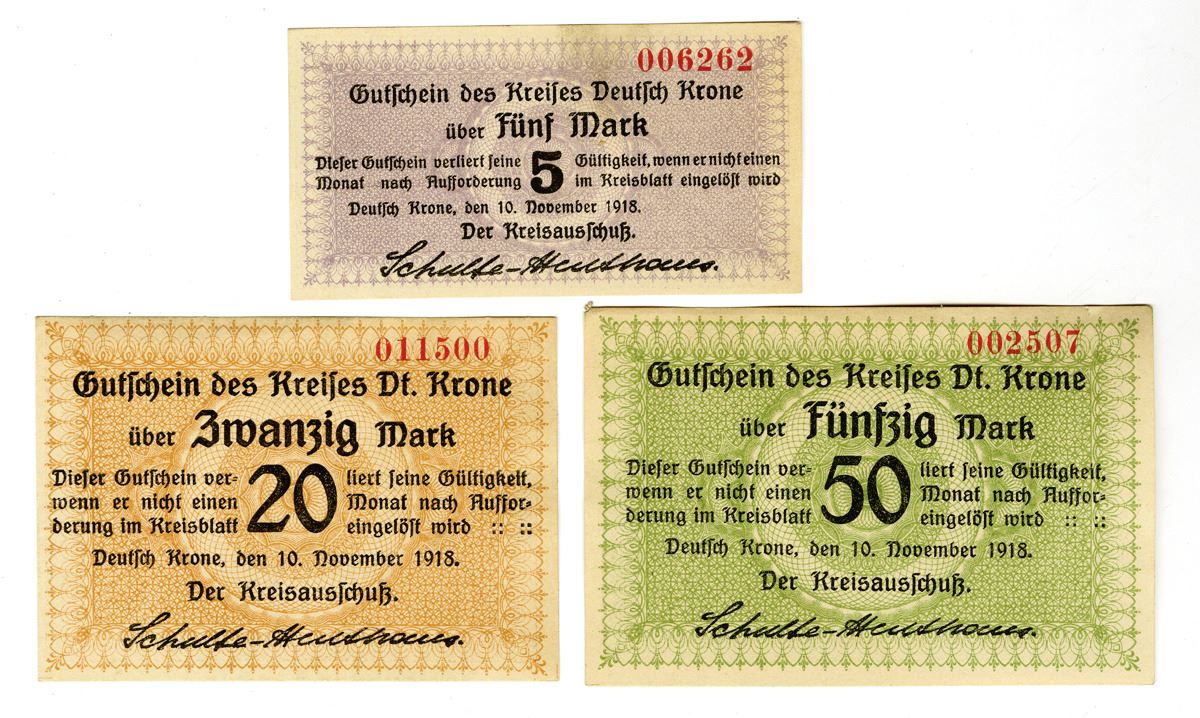 Germany, 1918. 3 Issued Notgeld Banknotes from the district of Deutch Krone: 4 Mark in purple; 20 Mark in brown; and 50 Mark in green. VF condition. (3)