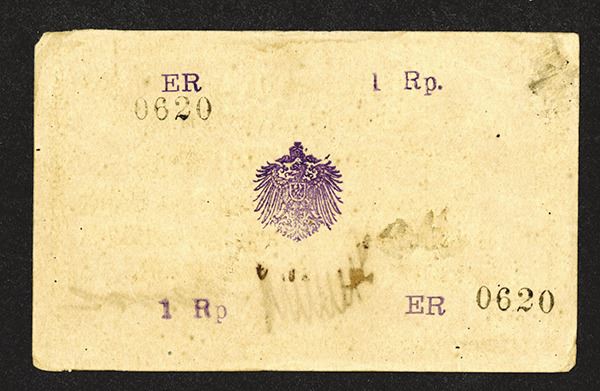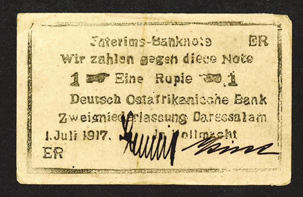 German East Africa. 1 Rupie, SCWPM 22c. Bold eagle on back, bold signatures. SN 0620. Rounded corners as expected, but still a nice Very Fine+ or better.