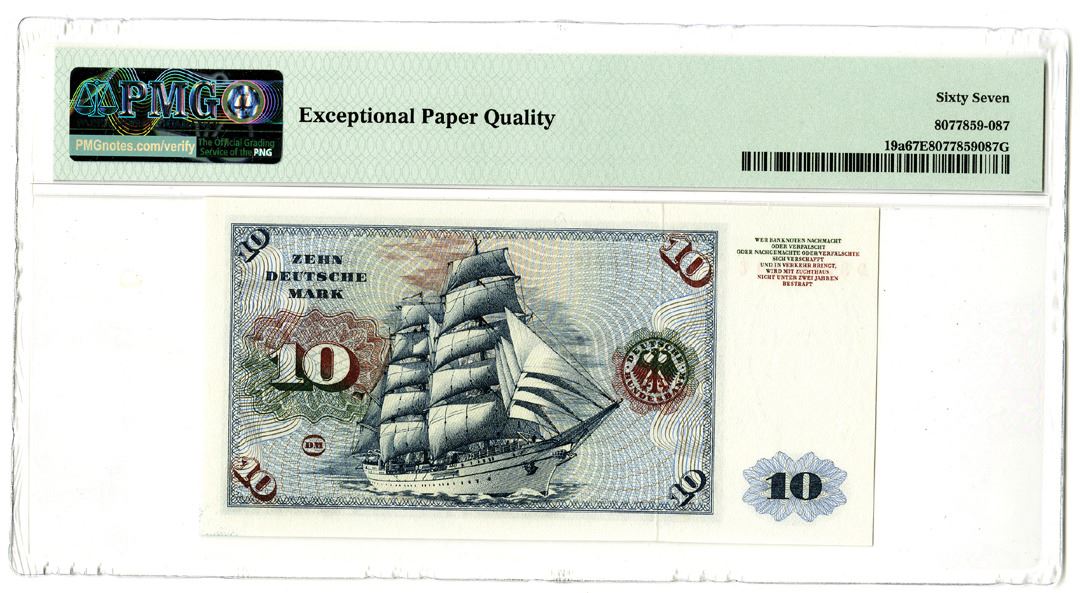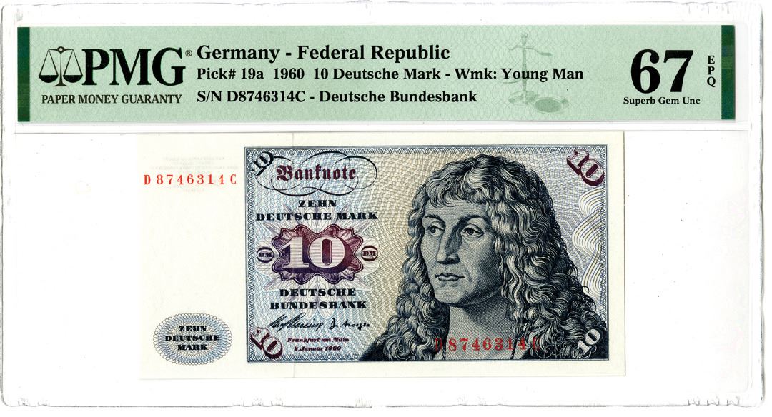 Germany. 1960. 10 Deutsche Mark, P-19a, issued banknote, PMG Graded Superb Gem Unc 67 EPQ. Only 1 note grades higher in the PMG census out of 45 graded.