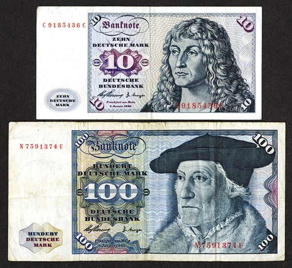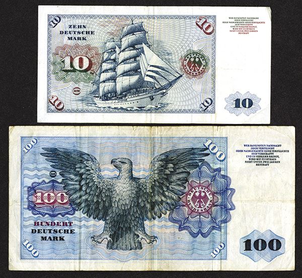 Germany. 10 Deutsche Marks, P-19, VF-EF; 100 Deutsche Marks, P-22, VF-EF. [2]