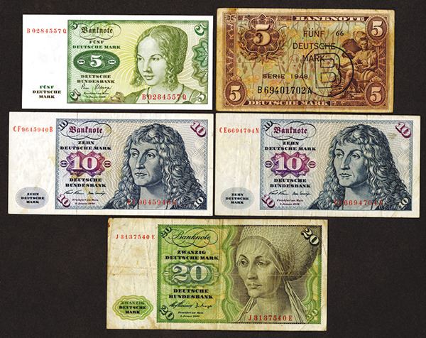 Germany. Banknote 5 Mark 1948 overprint B. SCWPM 4b Very Good, toned; 5, 10, 20 mark. SCWPM 30b Unc. 31a (2) Fine; 20a VG. 5 pieces.