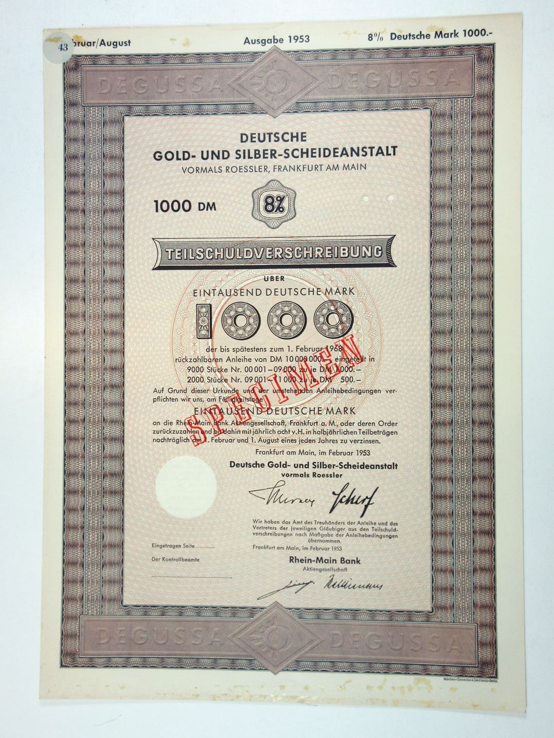 Germany, 1953. 1000 Mark Specimen 8% Bond in German, Brown text with brown border and light brown background. Red specimen overprint and POCs. VF condition with some staining. G&D.